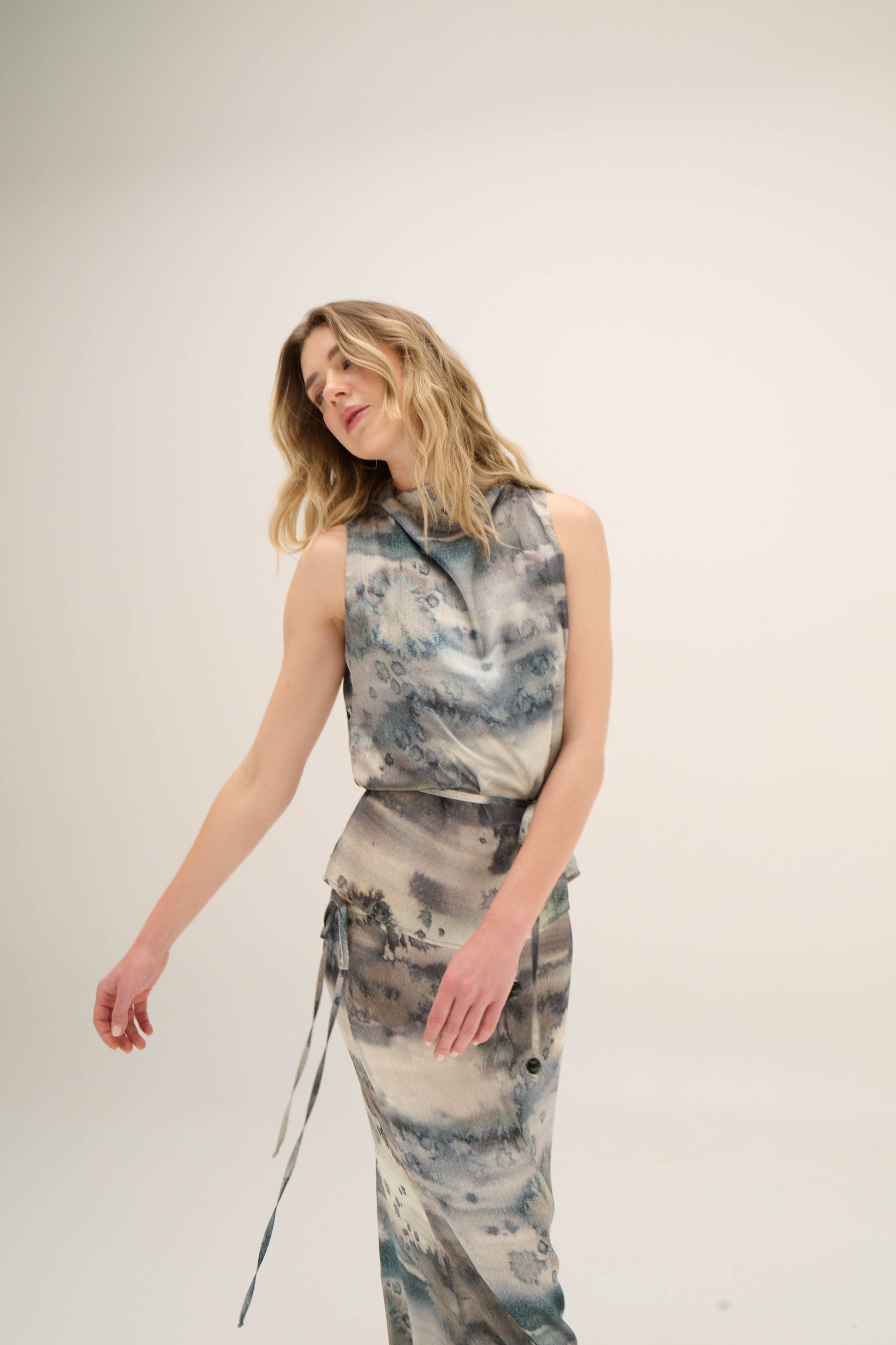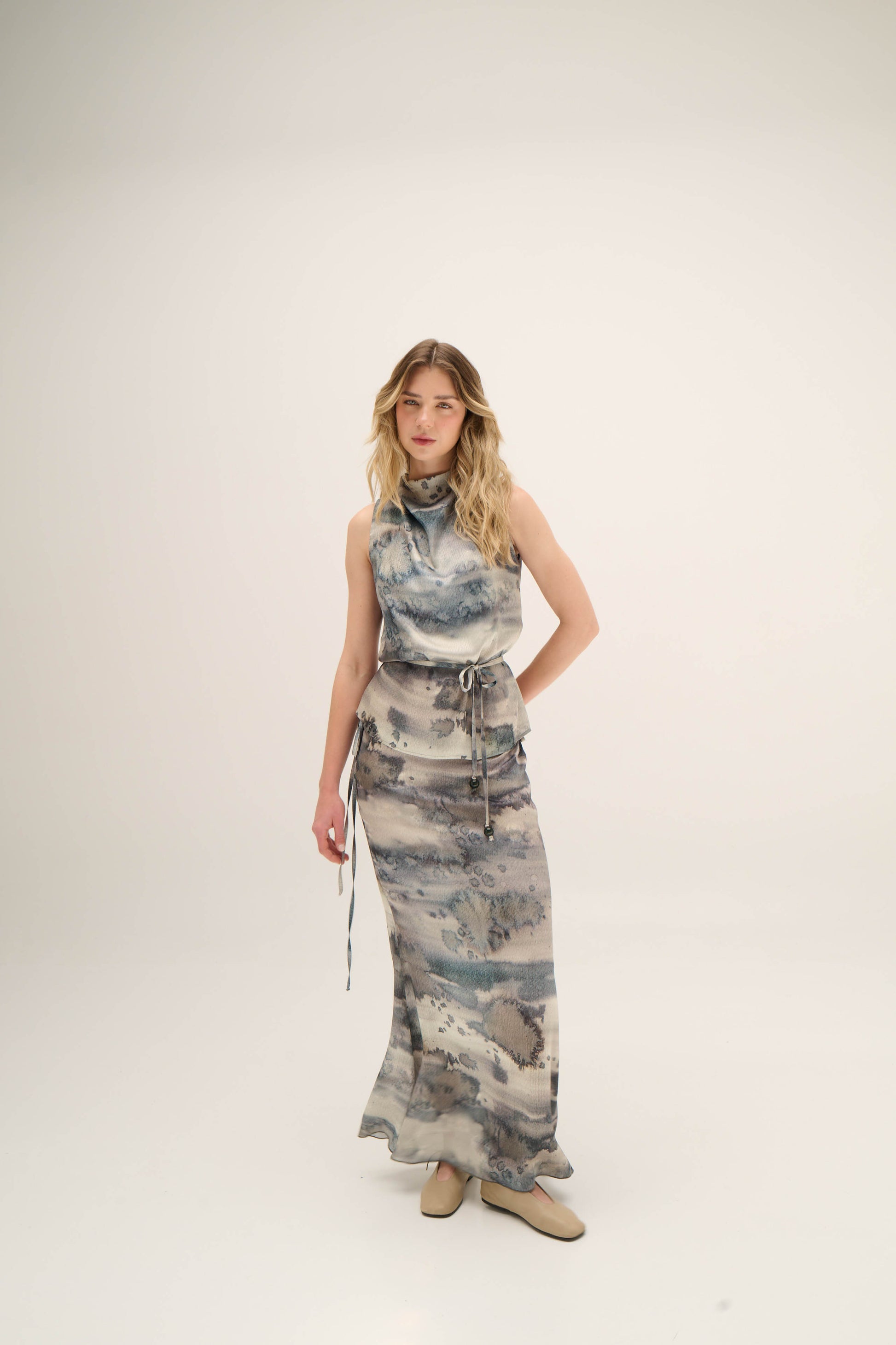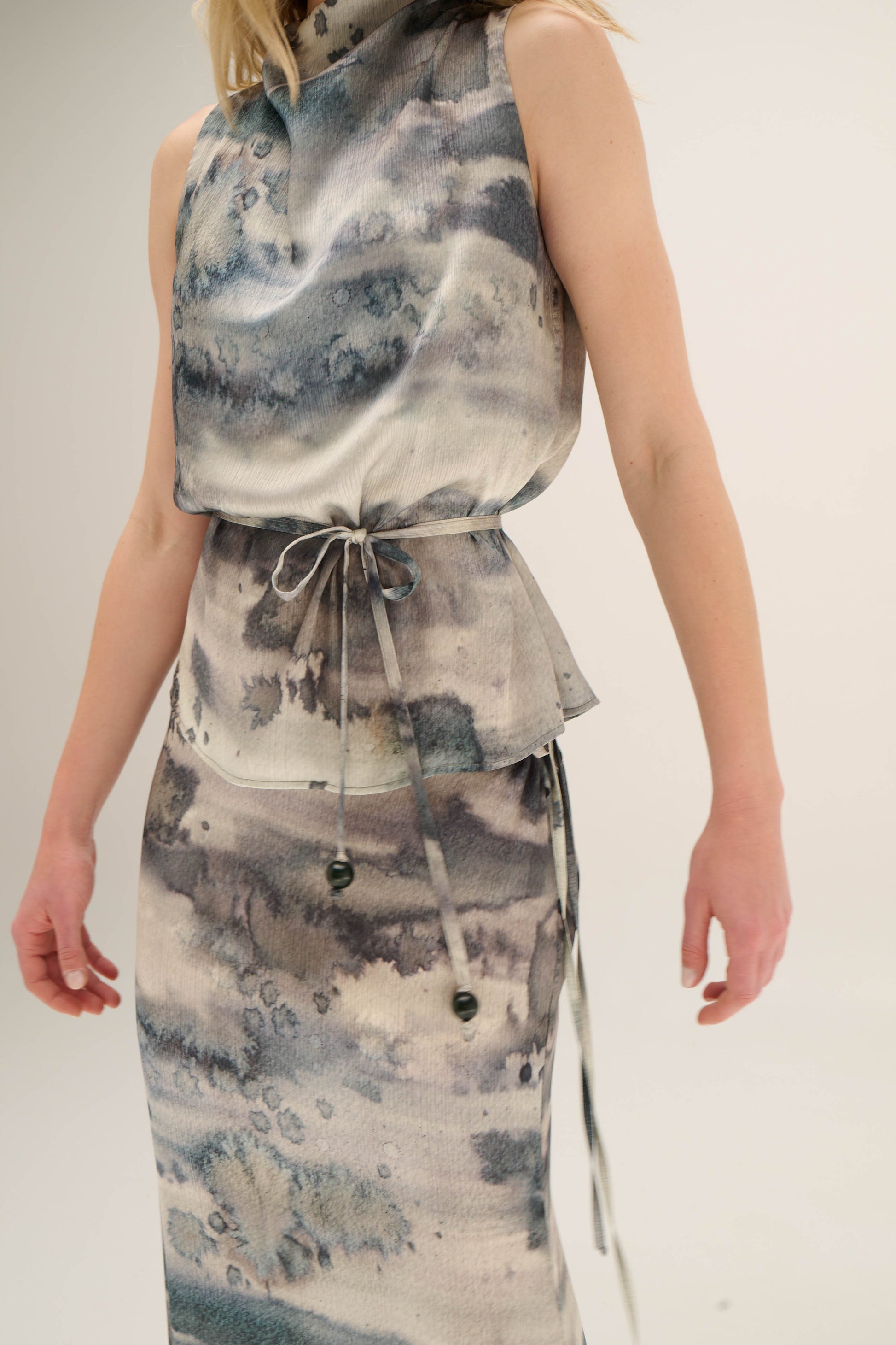 Blusa drapeada con cuello alto, espalda cubierta, cinturón en la misma tela y botones de tagua; permitiendo ajustar la cintura y definir la silueta con sutileza. Ideal para ocasiones formales, eventos especiales o para elevar un look con tus básicos favoritos.
